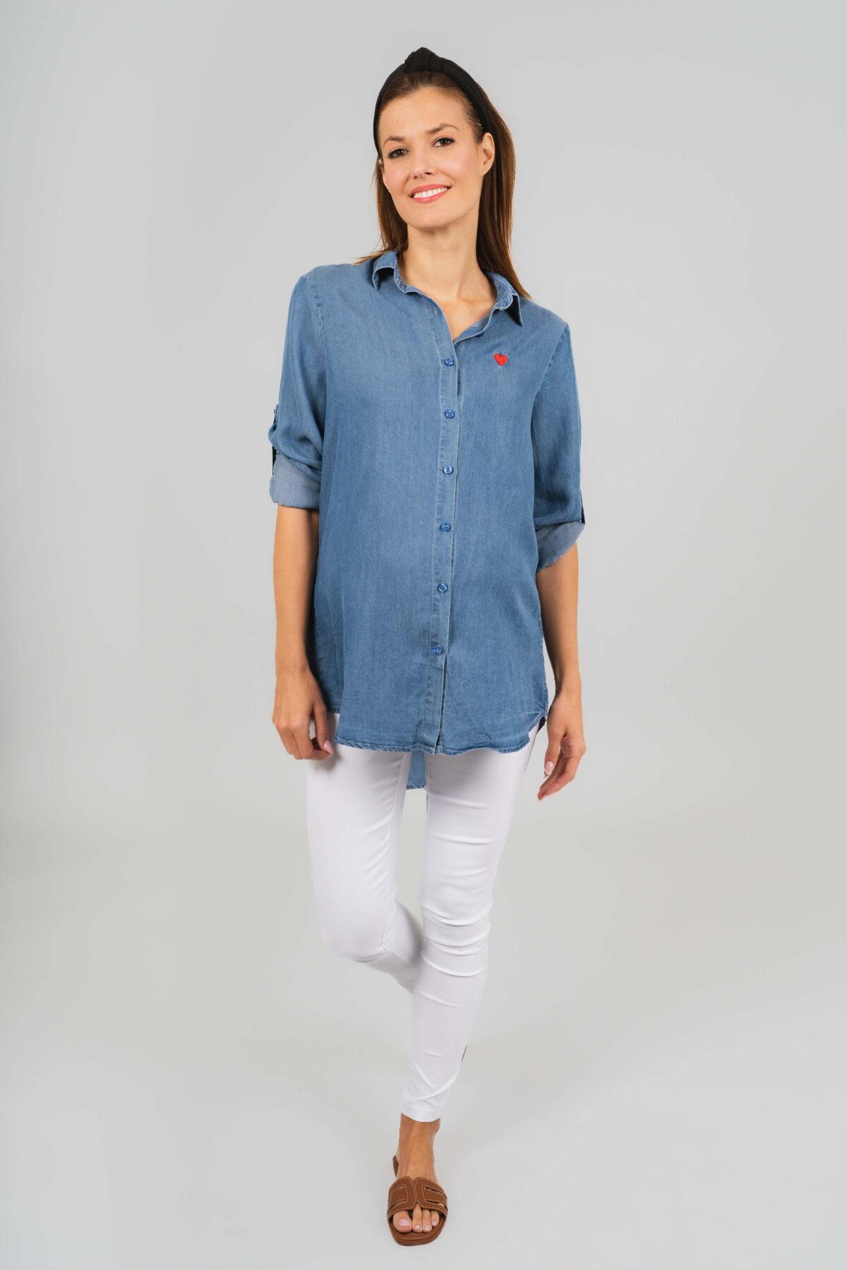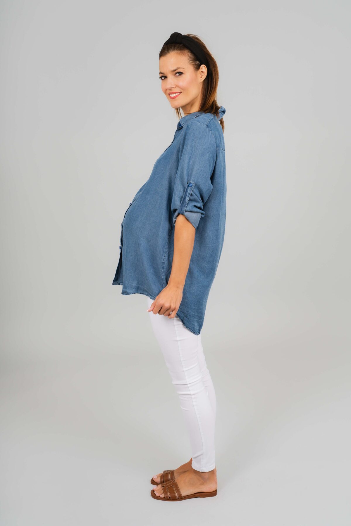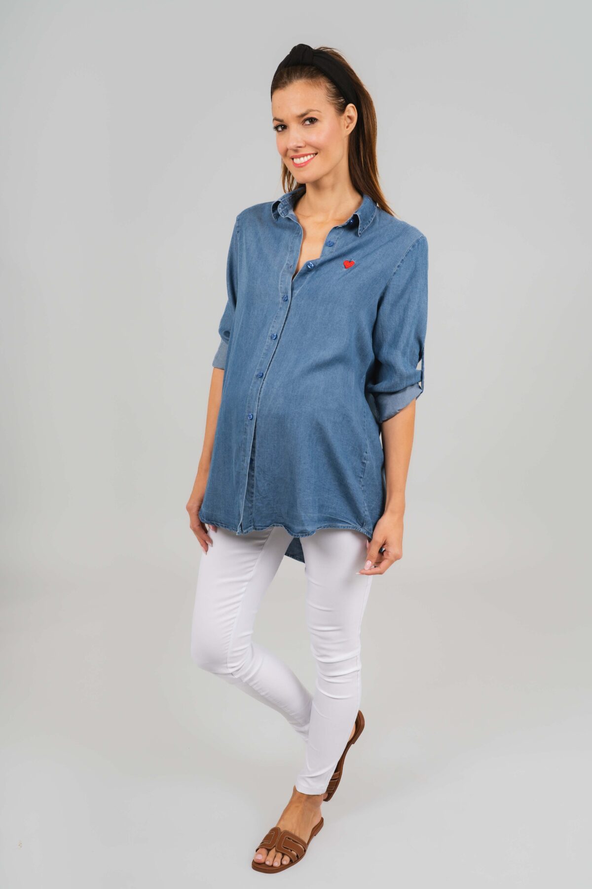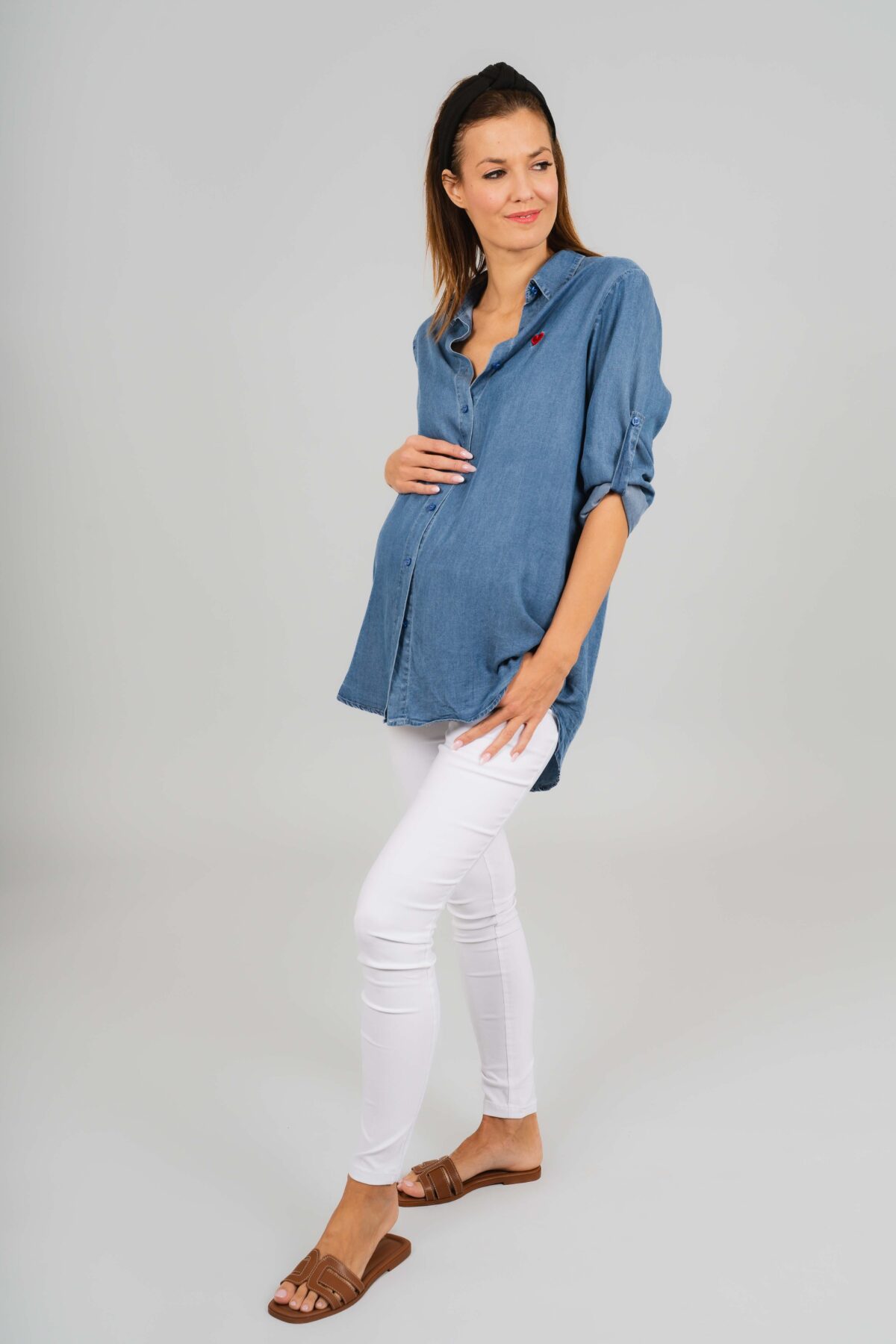 Hellobaby kismama farmeringünk egy kényelmes és stílusos alapdarab a várandósság időszakára. Vékony , puha tapintású denim anyagból készült, amely kellemes viseletet biztosít egész nap, miközben elegáns, letisztult megjelenést ad. Az ing enyhén bővülő szabású, így szépen követi a pocak formáját, és elegendő helyet biztosít a növekvő hasnak is. Jól kombinálható leggingsszel vagy szűk nadrággal.