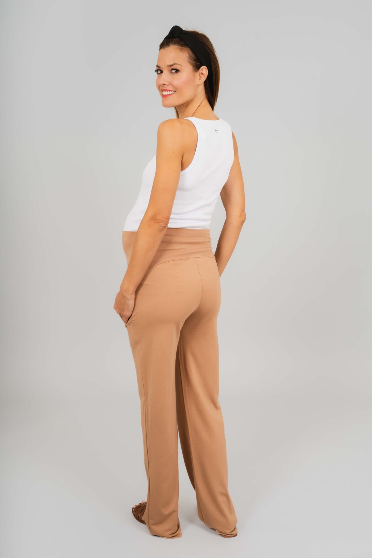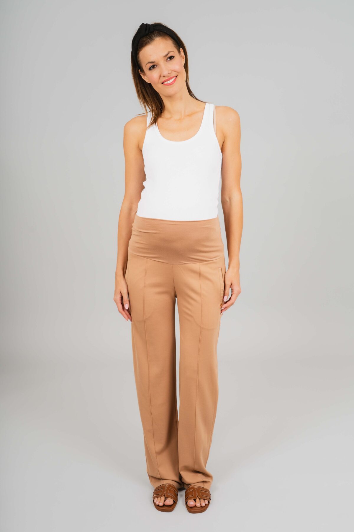 Hello Baby kismama nadrágunk elegáns vékony, bézs színű anyagból készült, laza egyenes szára extra kényelmet biztosít. Munkába vagy hétköznapra kellemes, elegáns viselet.